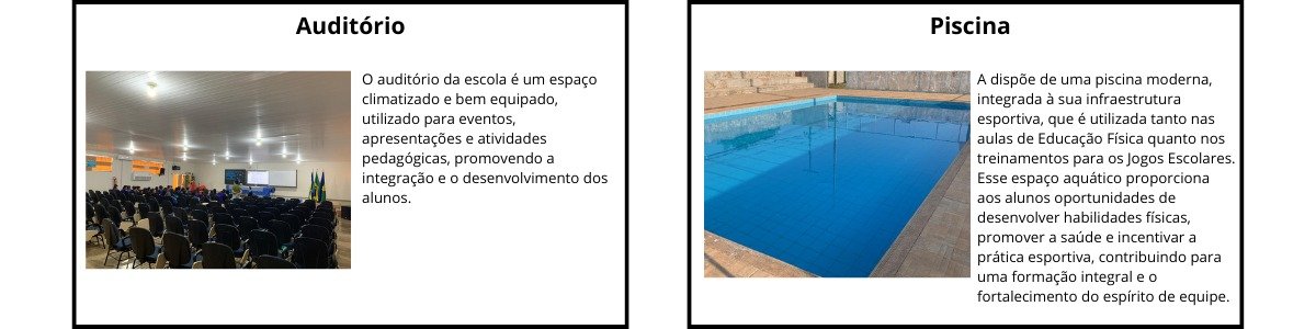 A escola conta com ambientes amplos, modernos e bem estruturados para garantir uma formação completa aos alunos. O auditório é climatizado e equipado para eventos, palestras e atividades culturais. A piscina é utilizada em aulas de Educação Física e treinamentos esportivos. A biblioteca oferece um espaço tranquilo e acolhedor para leitura, pesquisa e estudos. Além disso, a escola dispõe de salas de aula confortáveis, laboratórios bem equipados, refeitório e áreas de convivência que favorecem o aprendizado e o bem-estar de todos.