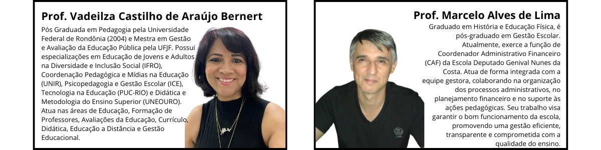 A equipe gestora da escola é comprometida com a qualidade educacional e o bem-estar da comunidade escolar, promovendo um ambiente acolhedor e eficiente para o sucesso dos alunos. Com liderança participativa e visão estratégica, fortalecem o vínculo entre escola, família e sociedade, garantindo uma educação pública de excelência.